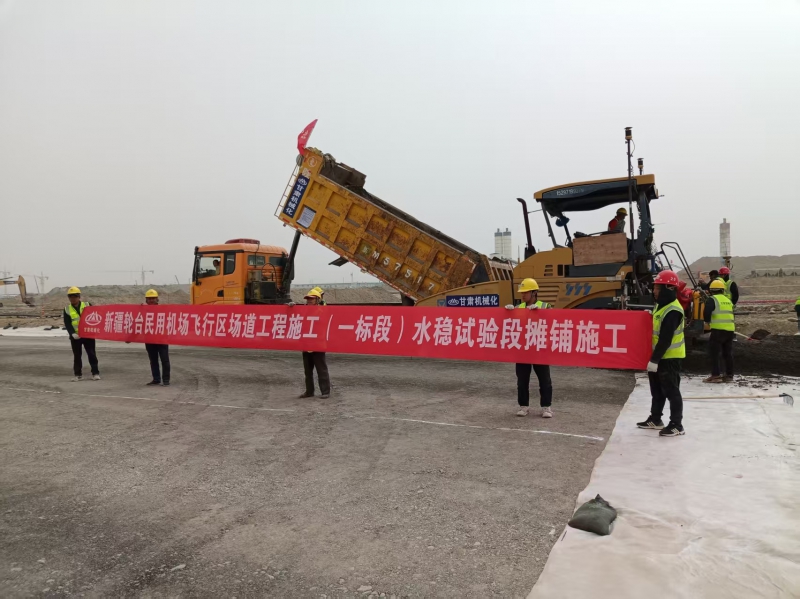 3月27日,新疆輪臺民用機場項目現(xiàn)場,隨著首車水泥穩(wěn)定砂礫混合料倒入攤鋪機,其緩緩啟動,我司承建的該項目飛行區(qū)場道工程(一標(biāo)段)水穩(wěn)基層施工正式開啟。